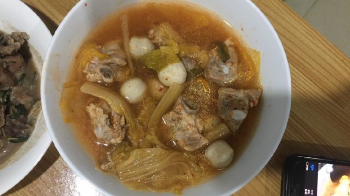 Kim chi có vị chua giòn kết hợp cá viên và sườn heo làm thành...